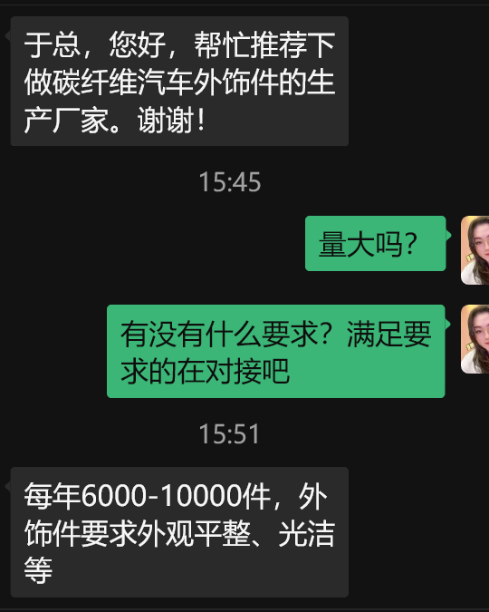 现寻求碳纤维汽车外饰件生产厂家,每年6000-10000件,外饰件要求外观平整、光洁等。复材网只推荐给会员单位,有意向厂家欢迎联系我们对接。