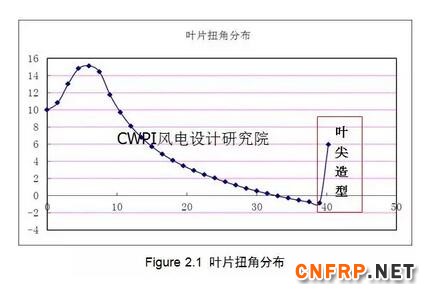分布叶片气动布局的扭角分布如Figure 2.1所示,叶片整体扭角一般小于16°,在叶片叶尖处扭角变化较大,由负角度急转为正角度。