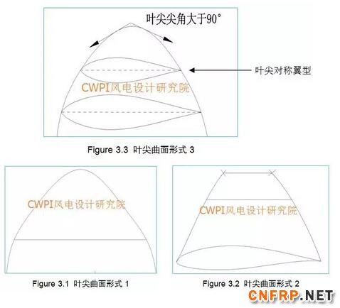 叶片的叶尖的曲面造型有多种形式,如Figure 3.1~Figure 3.2所示,综合考虑叶尖的曲面造型对气动性能和噪声的影响,我公司选择了Figure 3.3所示的叶尖曲面造型形式,叶尖处采用对称翼型的设计概念,减少叶尖处翼型