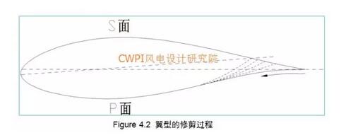 修剪翼型修剪翼型的参考均使用非叶尖区的后一个翼型,且向叶尖方向逐个修剪。修剪翼型从P面开始,弦线与轴线的夹角依次增大,修剪的点之间用曲线桥接,但要保证尾缘厚度。当尾缘厚度较小时,修剪尾缘至适当厚度。当被修剪的翼型P面和S面关于修剪后翼型的弦长对称时,则表示翼型修剪完成。