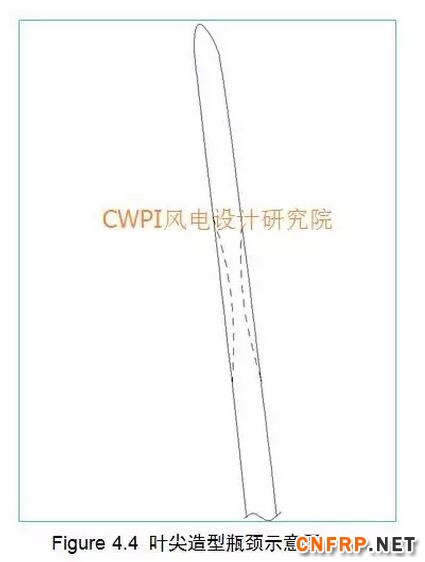 1. 叶尖在绘制时要保证叶片的外形,如果在修剪过程中扭角不满足要求,则需要先满足外形要求后再进行翼型的修剪。2. 经过翼型修剪后的叶片的预弯曲也需要满足叶片整体预弯的分布趋势,若预弯曲的分布曲线不平顺,则叶片叶尖的预弯值不变,调节叶尖其他的截面。3. 叶尖与叶片主体接合时要保证曲率连续,如若不能保证,至少要保证相切。修剪后的叶尖从前缘看去不能出现瓶颈。如Figure 4.4所示: