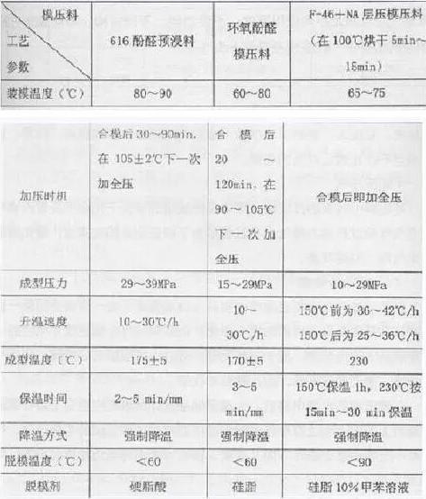 选定何种工艺主要取决于模压料类型,此外还应考虑生产效率及制品结构、尺寸性能要求等。慢速成型工艺见下表: