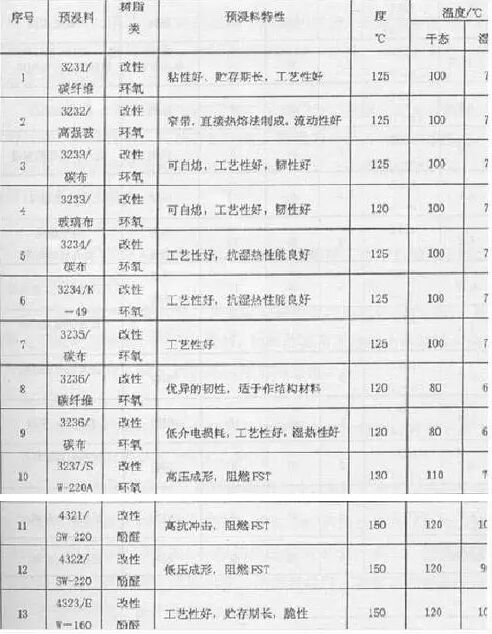 国内预浸料绝大部分用于制造体育休闲用品,基本是各公司自产自用,或从国外进口。国内已具备采用多种预浸工艺生产预浸料的能力,包括溶液法、直接热熔法、热熔胶膜法等。能制造单向预浸料,也能制造各种织物预浸料,研究开发树脂体系约30个,包括环氧、酚醛、双马、聚酞亚胺、氰酸酯等。拥有不同基体、不同增强材料制成的预浸料约50个品种,可以满足不同使用温度、不同功能、不同结构、不同成形方法对预浸料的要求,典型预浸料见下表: