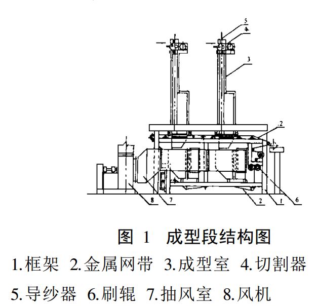 1.1成型段(见图1)是由12个导纱器、12套切割器、2个由不锈钢板制成的成型室、2个带风机的抽风室、不锈网带等主要部件组成的。