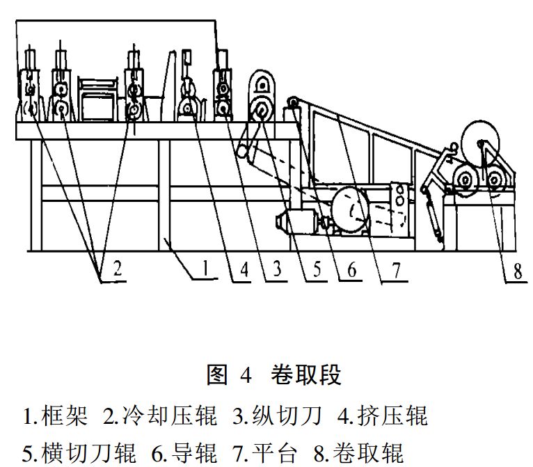 是由框架3、冷却辊2、纵切刀3、挤压辊4、横切刀5、卷取辊等主要部件构成的。