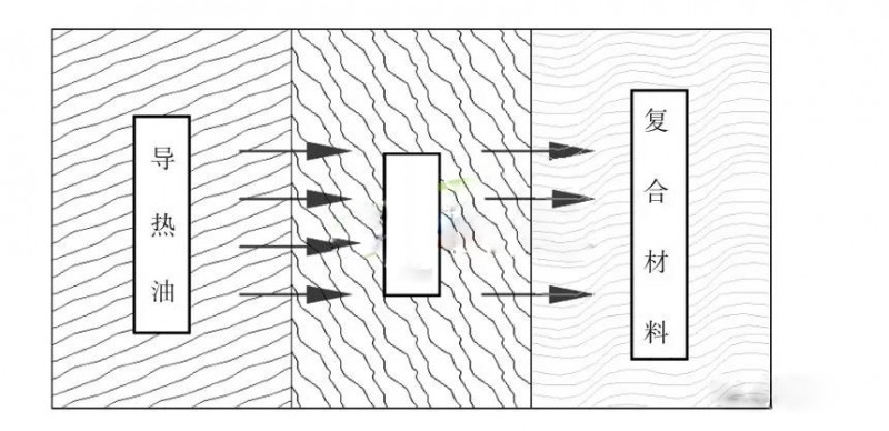 复合材料板弹簧热压成型方式存在较强的热对流,但热传导和热辐射同时存在。由于在强迫对流传热过程中,热辐射的影响很小,所以经常将其忽略。具体热压成型过程中,热量在导热油、金属模具和复合材料三个不同热学材料间互相传递,存在两个热量交界面,即导热油与模具交界面和模具与复合材料交界面,如图1所示。