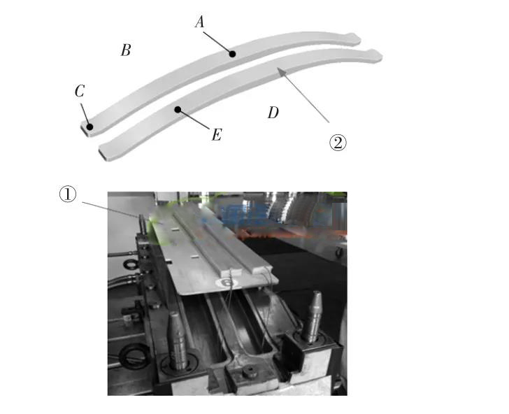 为了监测成型过程中板弹簧内部实际温度的变化情况,在板弹簧长度方向上的中间、1/4处以及端部分别布置热电偶,分别对应图17中两根板弹簧的A、B、C、D和E点,各点均处在板弹簧厚度方向的中间位置。同时,在仿真计算模型中相同位置处设置对应温度监测点。