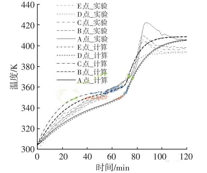 分析图中实测数据可以发现在第3个升温阶段,A、B、C点的温度先迅速增加而后逐渐回落并趋于稳定。其中,A点温度上升速度快,高温度接近150℃。这是由于复合材料板弹簧预浸料自身固化反应放热造成。A点处于板弹簧中间位置,预浸料存在的厚度大于B、C两点,固化反应放出的热量更多而耗散却相对较慢。当温度回落到135℃附件时,预浸料的固化反应已基本结束。由于流体软件目前无法模拟板弹簧预浸料由于自身温度升高而发生的固化放热反应,其在板弹簧的热传递过程中所发生的放热效果还无法准确评估,所以造成该阶段实验和计算曲线存在较大误差。