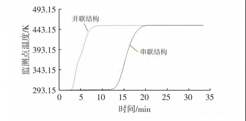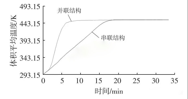 图10和图11给出了具体数据信息。图中数据表明并联结构可以在相对较短时间内使得管路内的体积平均温度和监测点A位置温度达到一个稳定值,所用时间小于10 min,较串联管路结构所需时间缩短一倍左右。这主要是因为并联结构存在频繁的分流和汇合现象,允许导热油快速流通整个管路,所以相对来说管路内的导热油流动更为快捷。但数据显示串联结构在加热达到稳定阶段时其体积平均温度比并联结构更为接近输入温度,两者差值大概为0.34 K(输入温度为453.15 K)。图12、图13和图14给出了某一时间节点下管路温度分布和稳态状态下两种管路的导热油速度分布和温度分布。可以看出,并联结构使得导热油能够快速流过整个管路,从而使得管路整体温度快速上升,但由于并联结构的存在,导热油主要沿着两条并行主干道流动,部分管路尾端由于供油不足而存在受热不均现象。而串联结构虽然在加热时间是上会有所延长,但导热油可以充分的填满整个管路,达到稳态后温度分布更为均匀,且稳态后油路温度分布更加接近理论输入温度。