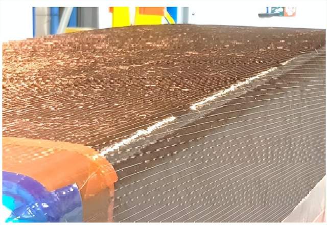 由Teijin 制造的双层碳纤维无卷曲织物(NCF)被指定用于翼梁。这里显示的是 NC 的翼梁低套件,在自动切割之后和预成型之前。