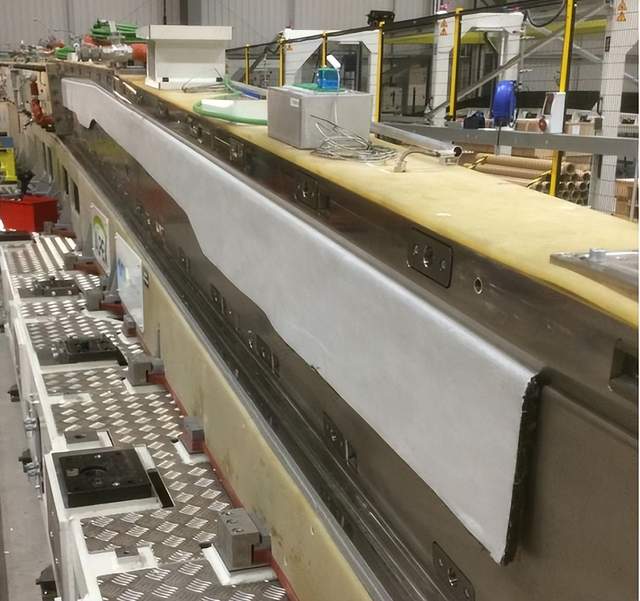 吉凯恩为第一批“未来之翼”翼梁开发了半自动化制造工艺,最终目标是几乎完全自动化制造。翼梁在这里完全预制,并准备进入到树脂转移模塑的生产工具。图片来源:GKN Aerospace