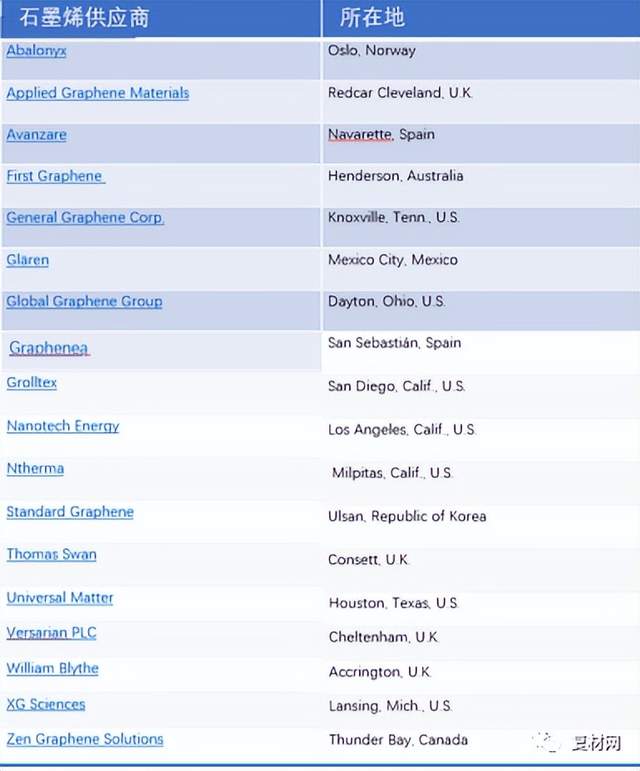 据Barkan称,目前有200多家公司声称供应石墨烯。不过,他说,其中约80%是小型实验室规模的操作。他估计,目前约有30家工业规模的石墨烯生产商在运营,新公司经常进入市场。以下是石墨烯理事会成员的商业石墨烯供应商名单: