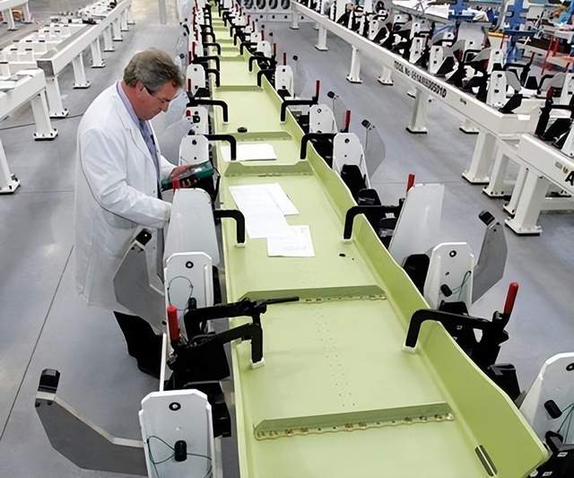 内翼梁更厚,起落架和襟翼有沉重的金属附件,首 先被带到一个大型五轴加工中心,该中心在复合材料零 件和金属配件上钻孔。从那里,夹具和内梁被运输到安 装紧固件的工位。中梁和外梁更薄,配件更轻,也被带 到机器人站,在那里钻所有的孔。在一架飞机所需的六 根梁上,总共钻了 16000 个孔。然后,将夹具和翼梁移 动到第二个机器人工作站,在所有配件都位于夹具中后,在该机器人工作站安装紧固件。