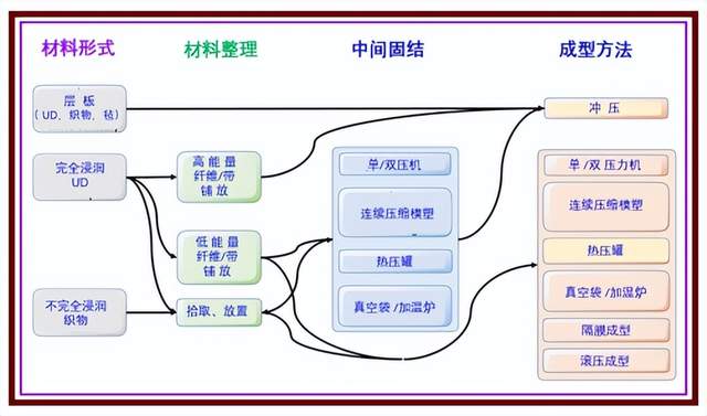 从自动铺丝(AFP)到冲压成型的快速加工方法需要完全浸渍的材料,因为在短暂的熔融周期内没有足够的时间进行浸渍。压缩模塑、热压罐和真空袋成型(VBO- vacuum bag only)等制造方法可以使用完全或部分固结的形式进行。通常,材料形式会根据性能要求进行选择,但对于热塑性复合材料(TPC),必须结合材料形式和制造方法进行选择。