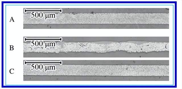 图5展示了两种单向预浸料及通过CCM工艺制成的八层准各向同性层压板的显微照片。显微照片中由于纤维相对于抛光方向的不同取向,层压板中各单层呈现出不同的纹理特征。预浸料样本B的差异明显传递到了最终制件中,尽管材料经历了熔融和高压成型工艺循环。