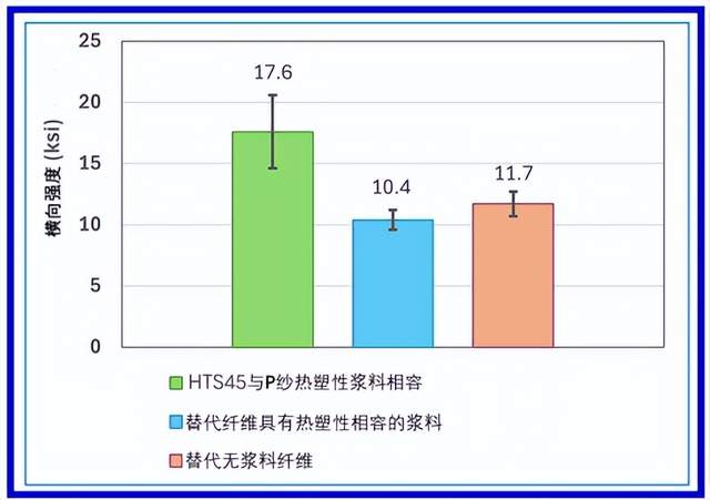 多年来,未上浆碳纤维因其与热塑性聚合物具有最佳界面而备受青睐。但这也带来了挑战,因为在浸渍和加工过程中可能会发生纤维损伤和磨损。最近,出现了与热塑性材料兼容的上浆剂,据报道它们能保护纤维免受损伤并提高界面强度,如通过横向弯曲强度测量所示(图9)。此处,据报道带有兼容热塑性上浆剂的断裂表面显示出更优异的纤维-基体粘结力。