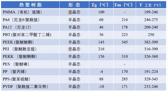 热塑性聚合物可以是分子链无规排列的非晶态,也可以是同时存在非晶区域与分子呈晶格排列区域的半结晶态。非晶态热塑性塑料不形成晶体结构,其成型/最高使用温度接近其玻璃化转变温度(Tg)。半结晶态热塑性塑料既具有Tg,又存在使晶体结构解体的熔融温度。采用半结晶态热塑性塑料制成的零件,其机械性能取决于结晶度,而结晶度则由零件制造过程中的冷却速率决定。(参阅上热塑性塑料对比图表。)