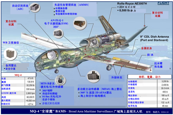 MQ-4 “全球鹰”与MQ-9“死神”是执行不同任务的先进无人机:MQ-4作为高空长航时(HALE)平台专司海上情报、监视与侦察(ISR),而MQ-9则是中空长航时(MALE)“猎杀者”无人机,设计用于精确打击及情报收集。 近日,两款美军主力先进无人机MQ-4“全球鹰”与MQ-9“死神”的核心技术支撑——先进复合材料应用,再度引发行业关注。作为高端无人机领域的标杆产品,两者凭借碳纤维增强复合材料等新型材料的广泛应用,实现了长航时、轻量化与低可探测性的性能突破,彰显了复合材料在航空装备领域的核心赋能价值。 据悉,MQ-4“全球鹰”作为高空长航时(HALE)无人机的代表,其机身、机翼、尾翼等主承力结构均大量采用碳纤维增强复合材料(CFRP),并搭配蜂窝夹芯结构设计。这种复合材料组合不仅大幅降低了机身自重,更在保证结构高强度、高刚性的同时,有效提升了无人机的结构效率,为其实现连续数十小时高空巡航、超远航程覆盖及广域情报、监视与侦察(ISR)任务提供了坚实的材料支撑。 与MQ-4侧重侦察不同,MQ-9“死神”作为中空长航时(MALE)察打一体无人机,同样将复合材料作为核心材料之一。其机翼、机身蒙皮、尾翼等关键部位广泛应用碳纤维复合材料,在实现轻量化的基础上,进一步优化了机身气动性能,提升了续航能力与武器挂载效率。同时,复合材料的应用也有效降低了无人机的雷达反射面积,增强了其战场隐蔽性,使其在执行精确打击与对地“猎杀”任务时更具优势。 业内人士表示,碳纤维增强复合材料等先进复材的应用,是现代无人机突破性能瓶颈的关键。MQ-4与MQ-9的实践充分证明,复合材料能够完美适配高端无人机对轻量化、高强度、长续航及低可探测性的核心需求,未来随着复材技术的不断升级,其在航空无人机领域的应用将更加广泛,推动无人机装备向更高效、更隐蔽、更智能的方向发展。 结合杨超凡内容,有改动,部分来源自互联网。