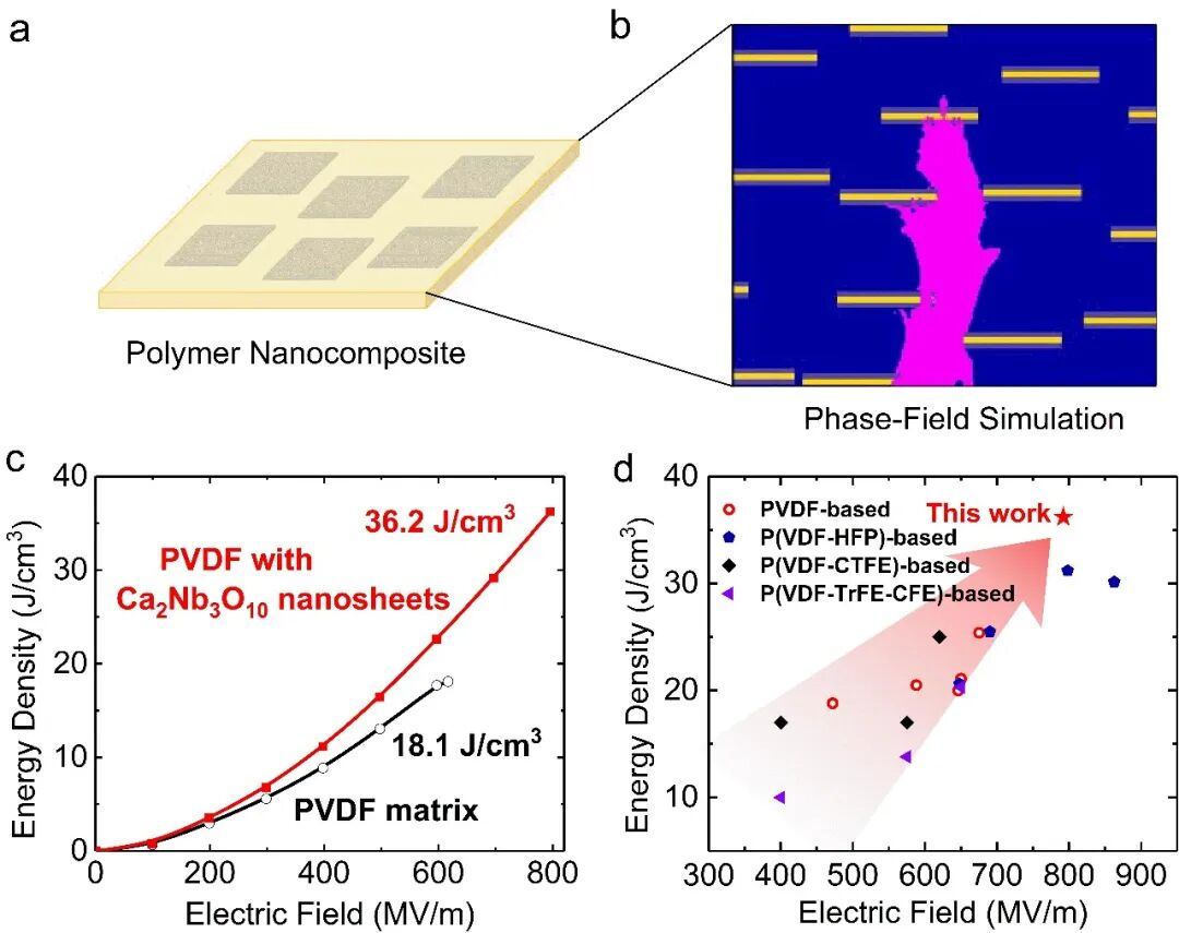 图例说明:a. 复合材料示意图。b. 复合材料电击穿过程的相场模拟中,带负电Ca2Nb3O10纳米片对电树枝发展起阻碍作用。c. PVDF基复合材料与纯PVDF的储能密度与电场的关系。d. 不同聚合物基纳米复合材料的击穿强度和能量密度的对比。