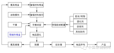 手糊成型又称接触成型。是用纤维增强材料和树脂胶液在模具上铺敷成型,室温(或加热)、无压(或加压)条件下固化,脱模成型的工艺方法。其主要流程为
