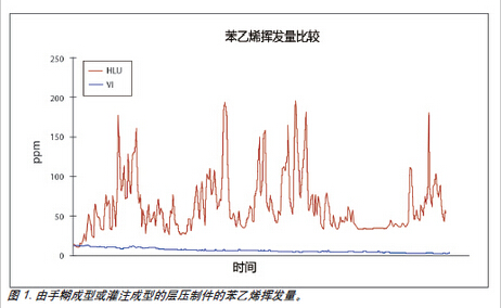 真空灌注成型在复合材料领域内的使用变得频繁,原因有很多,而主要的两大驱动力是苯乙烯挥发量得到了大幅减少,以及层压的固结度和强度更高。苯乙烯挥发量的减少将有助于满足未来任何降低的苯乙烯允许的挥发量标准。图1 展示了由手糊成型或灌注成型的层压件的典型苯乙烯挥发量。
