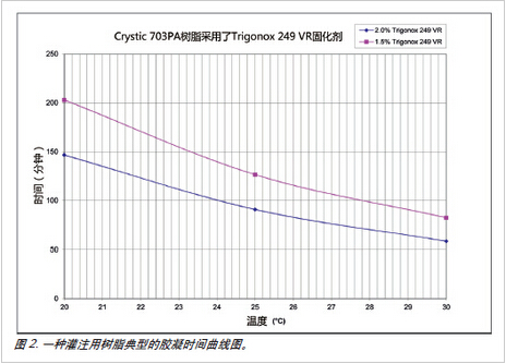 灌注工艺应该采用专为该工艺设计的专用树脂。市场上有很多可供选用的产品,它们涵盖了所有的树脂类型,例如ortho 型、iso 型、DCPD 型以及乙烯基酯型树脂。非常重要的是,所选树脂要能提供模具填充所需的胶凝时间,这个时间可能会很长。图2 为一种灌注用树脂典型的胶凝时间图。