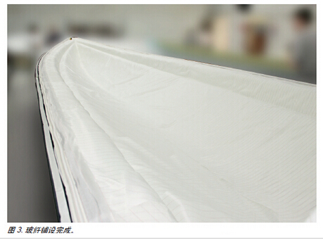 而后在表面层上铺设干燥的层玻纤,并用上文所述粘结系统加以固定。玻纤必须推入模具的所有角落,以避免产生孔洞。如果工艺将采用泡沫材料, 这时就可以进行铺放,如果存在任何的连接点,则必须在可能的情况下让泡沫表面的沟槽相拼合。好能够沿泡沫材料的外周长斜切,以使后续的玻纤更容易贴合。然后,其余的玻纤材料可以按需铺放。