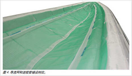 树脂流动螺旋管路铺设在层压板上方,而且这些管路应该缠绕在导流网上, 从而保证树脂的快速流动。为了让树脂在所有方向上平稳流动,流动管路的所在位置和长度都需要经过设计。使用大型模具时需要许多流动管路,这是因为填充速率将沿距离而减缓,推荐的大铺设间距为1 米。流动管路一旦铺设完成就应该进行合模面的检查,以保证没有松散的纤维,因为这将影响真空完整性。