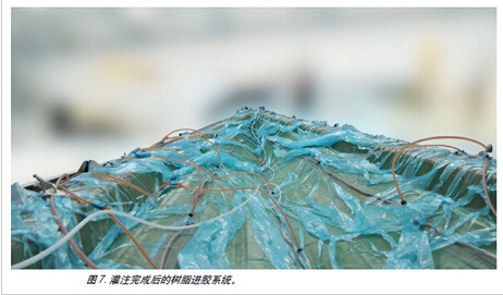 当真空袋处于真空密封状态,就可以连接树脂的进胶管,要再次注意, 这些管路在真空袋的安装位置上不能存在褶皱。这些树脂进胶管要从进料口连接到树脂桶,并应在安装前夹紧, 以防真空损失。将插入真空袋的进胶管末端削尖,然后在末端向上约25 毫米处用密封带缠绕。随后,将管道末端推入进胶口,穿入真空袋,再用密封条重新密封。这些地方都应用检漏器进行泄漏检查。图6 所示为已经完成准备工作的真空灌注工艺。