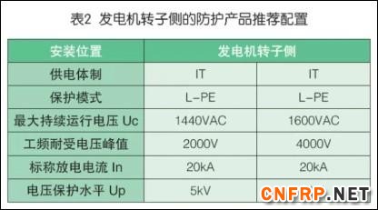 由于L - PE 之间会反复出现1.7kV、陡度为1.4kV/μs 的瞬时电压,如果SPD 导通电压低于该值,就会出现频繁导通的情况,从而加快了劣化、缩短寿命,因此用于转子L - PE 保护的SPD 导通电压>1.7kV, 对于低压SPD,MOV 的高标称导通电压为1620V - 1980V,所以单独采用MOV 的SPD 已无法满足防护安全需要,为了达到防护需求,现采用L - PE 之间采用压敏串联气放管的方式,来提高导通电压,避免上述现象的发生。发电机转子侧的防护产品推荐配置见表2。