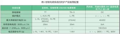 IT 系统中,L - PE 的Uc = UL - L,由于UL -L=690V±10 % , Uc 可选择750V ;在并网侧, 参照GB50057 - 2010 中4.3.8 第4 款的规定,每一保护模式的冲击电流当无法确定时应取≥ 12.5kA 的T1 类SPD,同时根据GB 50343 - 2012《表5.4.3 - 3 电源线路浪涌保护器冲击电流和标称放电电流参数推荐值》,也可采用≥ 50kA 的T2 类SPD, 因此对于TN - C 系统Uc 可选择为 440V, IT系统Uc 可选择 750V。发电机定子、变流器电网侧的防护产品推荐配置见表4。低压控制电源系统一般都处于LPZ1、LPZ2 或者后续防雷区, 根据GB 50343 - 2012 表5.4.3 - 3, LPZ1 -LPZ2 的配电箱可选择≥ 10kA 的T2 类SPD,LPZ2-LPZ3的配电箱,可选择≥ 3kA 或者≥ 6kV/3kA 的T2 或者T3 类SPD。控制电源系统的防护产品推荐配置见表5。