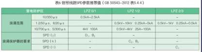 信号线路SPD 应根据线路的工作频率、传输速率、工作电压、接口形式等参数,选择插入损耗小、分布电容小、并与纵向平衡、近端串扰指标适配的SPD。信号线路SPD 的雷电防护区划分及配置示意图见表6(GB 50543 -2012 表5.4.4)。