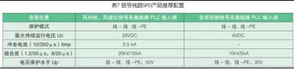 根据图8(IEC 61400 - 24:2010)中风电机组防雷区的划分,风向标、风速仪处于LPZ0 区,因此采集线路进入PLC 的输入端,应该配置D1 类信号SPD。信号线路SPD产品推荐配置见表7。