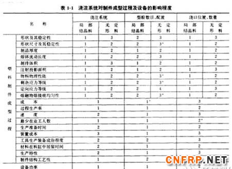 注塑模浇注系统对注射成型质量有重要的影口向。如浇口设汁不当会造成模具喷嘴、浇口堵塞;型芯、杆类零件错位,脱模不良,制品出现填充不足、飞边。塌坑、空洞、流料痕、熔接痕、银条纹、气泡、挠曲、弯曲、扭转等缺陷都与浇注系统有关。浇注系统对制件成型过程及设备的影响程度见表1—1。