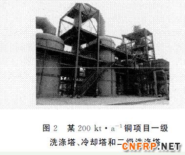 早期洗涤塔的设计多采用合金钢或铅结构,但成本高、质量大,不易制作,耐腐蚀效果也不理想,使用寿命短。现在的洗涤塔、冷却塔以及配套的斜板沉降槽、上清液贮槽、事故高位槽等已全部采用玻璃钢制作,塔主体为正圆形,多采用中碱玻璃纤维纱浸环氧乙烯基酯树脂缠绕制备,有时树脂中还会添加玻璃微珠或其它填料等来增加制品的刚性或其它特种性能。目前玻璃钢厂家采用缠绕机来生产圆形塔或罐等玻璃钢制品,生产效率高,产品质量稳定,尺寸精确。相比同等质量要求的金属制品,可减少40%~60%的质量,而且对于较大型的设备,可通过切割和现场粘接组装来简化运输要求,具有更好的技术和经济效果。如图2所示为某200kt·a-1铜项目的一级洗涤塔、冷却塔和二级洗涤塔。