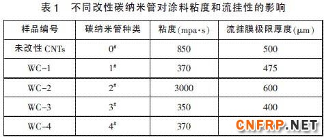 使用不同改性方法处理的碳纳米管,制备出不同的水性环氧防腐抗静电涂料,其粘度和抗流挂性如表1。