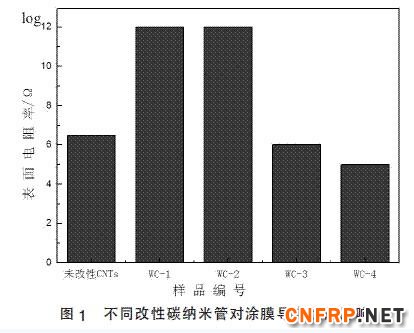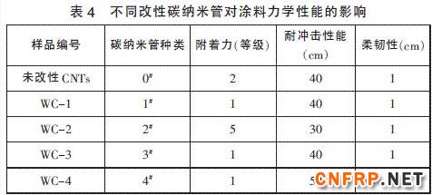 不同改性方法处理的碳纳米管对涂膜导电性的影响如表4。由表4可知:WC-1、WC-3、WC-4涂膜的附着力及耐冲击性能有所提高,说明加入1#、3#、4#碳纳米管可以提高涂膜的力学性能;而WC-2涂膜的附着力及耐冲击性能降低了,说明了加入2#碳纳米管降低了涂膜的力学性能,进一步说明了2#碳纳米管与水性环氧树脂的相容性较差或者可以说是与环氧树脂的固化过程相互有影响。