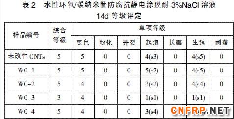 对制备的水性环氧/碳纳米管防腐抗静电涂膜进行耐3%NaCl溶液实验,其14d腐蚀等级评定见表2。由表2可知,WC-3涂膜的防腐性优,说明3#碳纳米管与环氧树脂的相容性好,因此涂膜的致密性较好,提高了涂膜的耐腐蚀性。