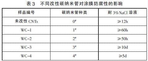 不同改性方法处理的碳纳米管制备的涂膜防腐性见表3。由表3可知,未经过改性的碳纳米管制备的涂膜耐3%NaCl溶液腐蚀能力小于24h,而WC-1~WC-4涂膜耐3%NaCl溶液腐蚀能力超过了72h,WC-3涂膜耐3%NaCl溶液的腐蚀时间长,大于10d。说明了经过改性后的碳纳米管,使得与涂膜的相容性和分散性得到改善,形成了致密的涂膜层。其中3#碳纳米管制备的涂膜防腐性优,4#碳纳米管制备的涂膜防腐性次之,1#、2#碳纳米管制备的涂膜防腐性较差。