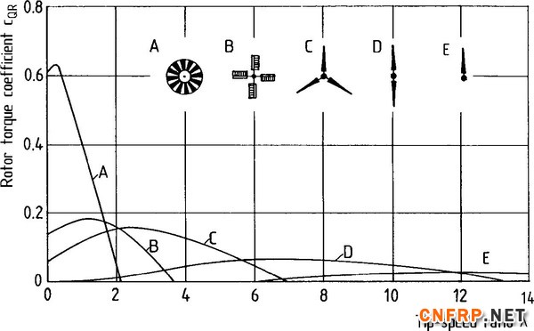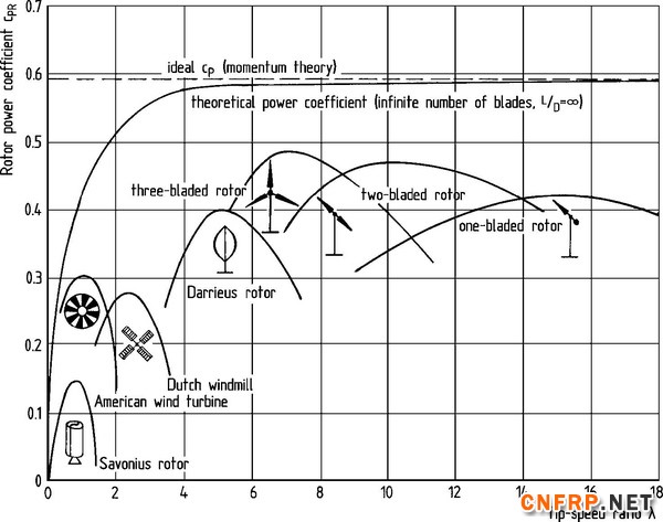 叶轮的效率存在优值。从历史的角度讲,现代三叶片风机的优达到了高水平,约为0.48~0.49。下图来自Erich Hau的Wind Turbines, 2nd Ed.