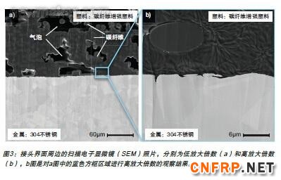 图3为碳纤维增强塑料片材和304不锈钢板之间接头接合面的扫描电子显微镜(SEM)照片。许多亚毫米大小的气泡不规则地分布在碳纤维周围的塑料基体中,这是由激光焊接过程中溶池的高温引起的热传导造成的。据证实,碳纤维增强塑料中气泡的几何特征主要取决于塑料和碳纤维的叠合形状,以及传导热量的水平和碳纤维的长度。据悉,与普通塑料相比,碳纤维增强塑料中更容易形成气泡。对普通塑料来说,气泡只形成在界面附近;而在碳纤维增强塑料中,由于纤维表面与基体之间的不稳定以及碳纤维具有较高的热导率,所以气泡广泛分布在塑料基体中。