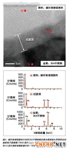 图4是接头界面附近的透射电子显微镜(TEM)照片,从PA基体、不锈钢上的氧化膜、不锈钢基体中分别选取典型的点来进行透射电镜能谱分析(TEM-EDS)。我们可以观察到,碳纤维增强塑料从原子或分子尺度上被连接在304不锈钢的10纳米厚的铬铁(Cr-Fe)氧化层上。这表明,化学键合和物理(范德华力)粘结的可能性很高。因此,碳纤维增强塑料和304不锈钢能被牢固地接合在一起形成强而有力的接头。