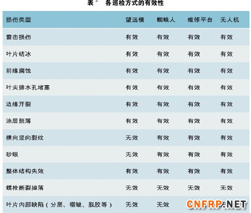 目测检查是对叶片表面故障直接、有效的检测方法。对于非表面故障,目测检测并不能提供太多帮助。对于较小对表面损伤,用高倍望远镜检查不容易发现故障。蜘蛛人和叶片维修平台检查是比较彻底的表面检查,缺点是检测时间长、费用高、效率低,不适合进行日常巡检。