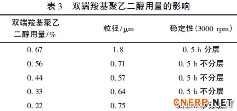 在环氧128扩链后,先加入少量双端羧基聚乙二醇使其和扩链后的环氧128反应生成一种阴离子型-反应型的环氧乳化剂,接着再和扩链后的环氧128反应生成一种具有自乳化能力的环氧树脂,接着再让绝大部分未反应完的扩链后的环氧128和非离子-反应型环氧乳化剂生成另一种具有自乳化能力的环氧树脂。这样两种环氧乳化剂不仅和环氧树脂有相似的结构,又发挥了两者的共同优势,从而有利于进一步降低分散体的粒径,又有利于提高分散体的稳定性[9-10]。表3是双端羧基聚乙二醇用量对环氧水分散体的粒径、稳定性的影响情况。