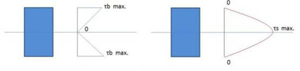 在处于这个状态时,这根硬质梁所承受的是弯矩和剪力。对于硬质梁的每一个微小平面而言,所产生的力就是正应力和切应力,且这个微小的平面所承受的正应力和切应力是呈现出下图中的分布态势。