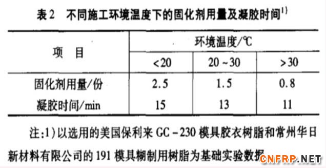 通常树脂固化体系的配比为在100份uP中加入2份环烷酸钴(作促进剂)和0.5—3.0份过氧化甲乙酮固化剂。固化剂的用量随施工环境温度的变化而变化,以此来调节凝胶时间,以便有足够的施工时间。根据试验得出的固化剂用量及凝胶时间列于表2。由表2可以看出,施工环境温度过高时,仅仅依靠减少固化剂用量是不行的。为了保证有充足的施工时间,需加入0.08%的阻聚剂间苯二酚。