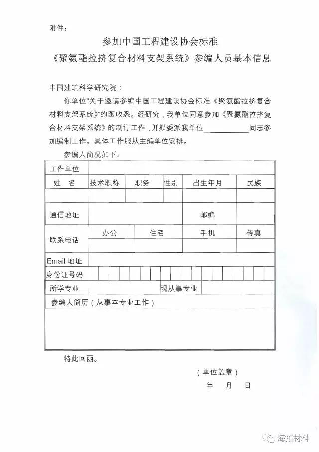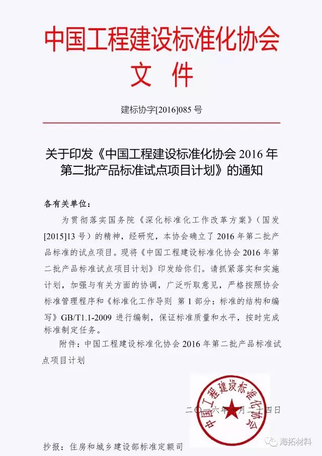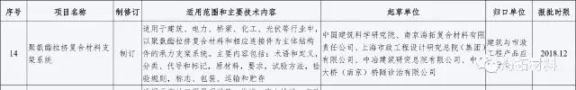为贯彻落实国务院《深化标准工作改革方案》(国发[2015]13号)的精神,工程建设标准化协会确立了2016年第二批产品标准的试点项目。其中,由建筑科学研究院和南京海拓复合材料有限责任公司会同有关单位负责对《聚氨酯拉挤复合材料支架系统》这一标准进行制订。该标准的归口单位为建筑与市政工程产品应用分会,报批时限为2018年12月。