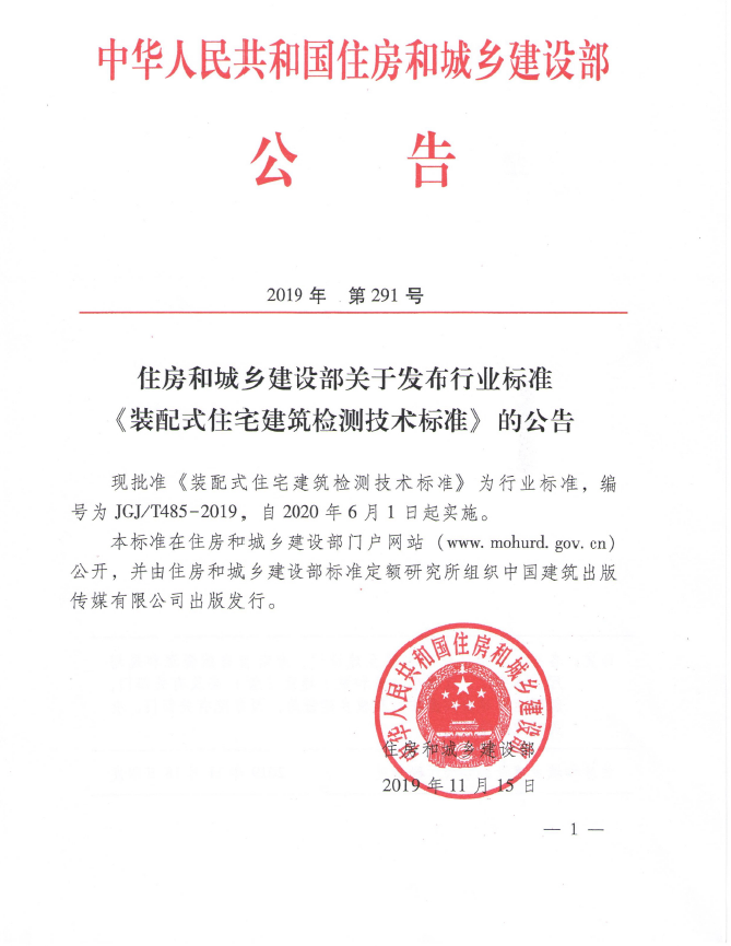 记者从住房和城乡建设部官网获悉,编号为JGJ/T485-2019的《装配式住宅建筑检测技术标准》将于今年6月1日起正式实施。