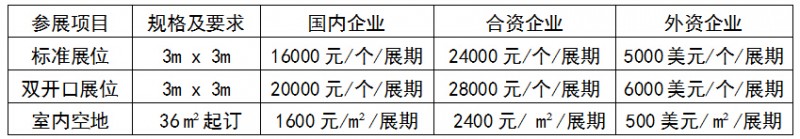 标准展位配置:中英文楣板、日光灯两盏、隔板(高度250cm,可用高度246cm)、洽谈桌一张、椅子两把、可容400W/220V电源插座一个及地毯;注:参展费用含(发票、咨询服务)