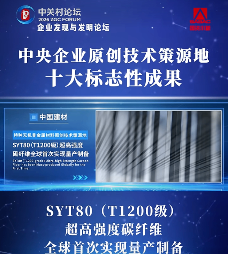 近日,在2026中关村论坛期间,国务院国资委举办以“加强原始创新 开启生物新章”为主题的企业发现与发明论坛,发布“中央企业原创技术策源地十大标志性成果”,中国建材中复神鹰“SYT80(T1200级)超高强度碳纤维全球首次实现量产制备”荣列其中,有力彰显了中央企业作为国家战略科技力量,发挥科技创新主体作用、发力原始创新的坚定决心和责任担当。